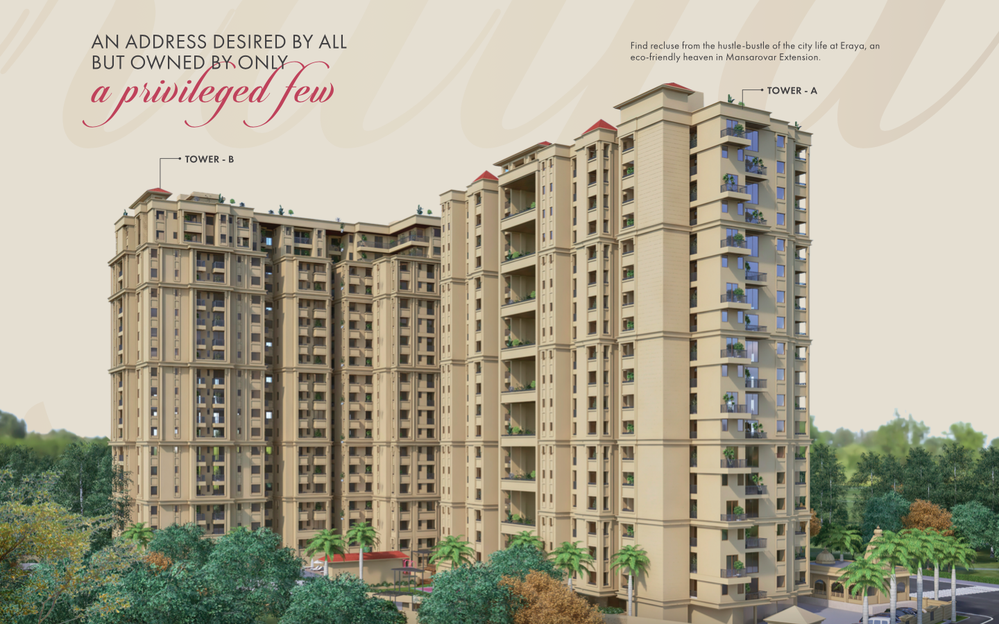Eraya - Luxury Apartments by Chordia Builders is a thoughtfully crafted residential destination designed for refined urban living in Mansarovar, Jaipur. Rising elegantly as a G+18 development, Eraya offers spacious 3, 4, and 5 BHK Duplex luxury apartments that blend modern architecture with functional design and premium finishes. Each home is planned to welcome abundant natural light, excellent ventilation, and a sense of openness that enhances everyday comfort. The project is enriched with lifestyle amenities including a well-appointed clubhouse for social gatherings, dedicated fitness and recreation spaces, landscaped areas for relaxation, and thoughtfully designed common zones that encourage community living. Safety and peace of mind are ensured through trained security guards, controlled entry points, and a secure residential environment. The strategic location in Mansarovar provides easy access to essential conveniences such as schools, hospitals, shopping areas, and major city routes, making daily life effortless. Developed by Chordia Builders, Eraya reflects a commitment to quality construction, attention to detail, and long-term value. For homebuyers looking to buy flats in mansarovar that offer luxury, comfort, and a complete lifestyle experience, Eraya stands as a perfect blend of elegance, convenience, and modern living.